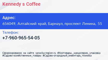 Kennedy`s Сoffee по адресу 656049, Алтайский край, Барнаул, проспект Ленина, 55 в дальнейшем Организация, размещена в следующих категориях: