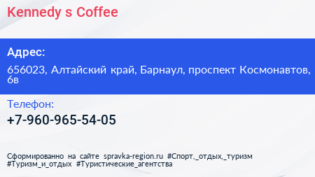 Kennedy`s Сoffee по адресу 656023, Алтайский край, Барнаул, проспект Космонавтов, 6в в дальнейшем Организация, размещена в следующих категориях: