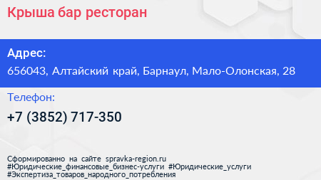 Крыша, бар-ресторан по адресу 656043, Алтайский край, Барнаул, Мало-Олонская, 28 в дальнейшем Организация, размещена в следующих категориях: