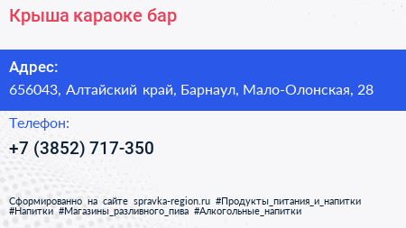 Крыша, караоке-бар по адресу 656043, Алтайский край, Барнаул, Мало-Олонская, 28 в дальнейшем Организация, размещена в следующих категориях: