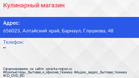 Кулинарный магазин по адресу 656023, Алтайский край, Барнаул, Глушкова, 48 в дальнейшем Организация, размещена в следующих категориях: