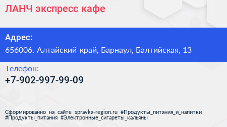 ЛАНЧ, экспресс-кафе по адресу 656006, Алтайский край, Барнаул, Балтийская, 13 в дальнейшем Организация, размещена в следующих категориях: