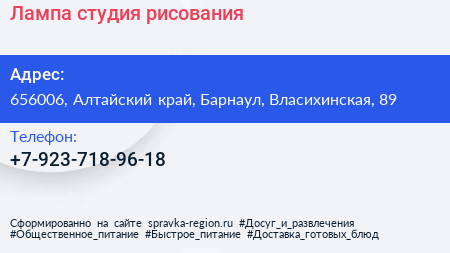 Лампа, студия рисования по адресу 656006, Алтайский край, Барнаул, Власихинская, 89 в дальнейшем Организация, размещена в следующих категориях: