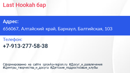 Last Hookah, бар по адресу 656067, Алтайский край, Барнаул, Балтийская, 103 в дальнейшем Организация, размещена в следующих категориях: