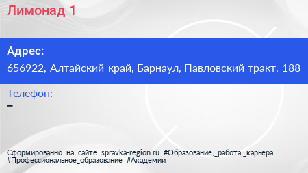 Лимонад №1 по адресу 656922, Алтайский край, Барнаул, Павловский тракт, 188 в дальнейшем Организация, размещена в следующих категориях: