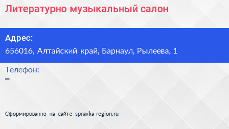 Литературно-музыкальный салон по адресу 656016, Алтайский край, Барнаул, Рылеева, 1 в дальнейшем Организация, размещена в следующих категориях: