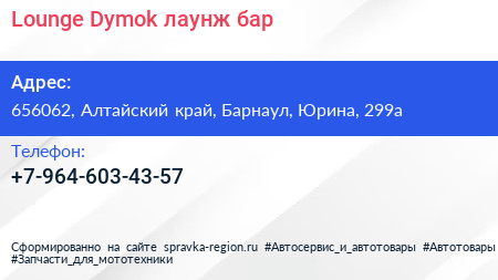 Lounge Dymok, лаунж-бар по адресу 656062, Алтайский край, Барнаул, Юрина, 299а в дальнейшем Организация, размещена в следующих категориях: