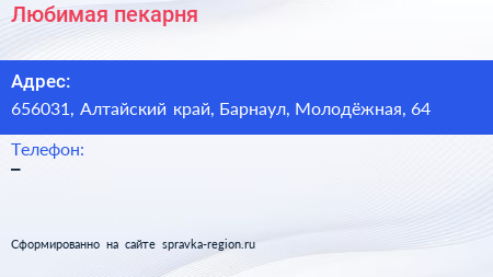 Любимая, пекарня по адресу 656031, Алтайский край, Барнаул, Молодёжная, 64 в дальнейшем Организация, размещена в следующих категориях: