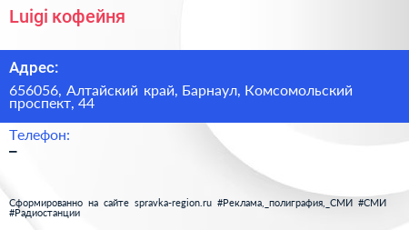 Luigi, кофейня по адресу 656056, Алтайский край, Барнаул, Комсомольский проспект, 44 в дальнейшем Организация, размещена в следующих категориях: