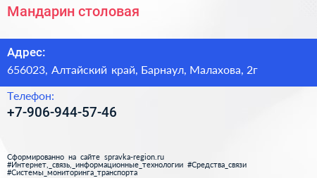 Мандарин, столовая по адресу 656023, Алтайский край, Барнаул, Малахова, 2г в дальнейшем Организация, размещена в следующих категориях: