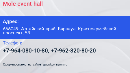 Mole event-hall по адресу 656049, Алтайский край, Барнаул, Красноармейский проспект, 58 в дальнейшем Организация, размещена в следующих категориях: