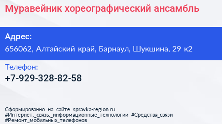 Муравейник, хореографический ансамбль по адресу 656062, Алтайский край, Барнаул, Шукшина, 29 к2 в дальнейшем Организация, размещена в следующих категориях: