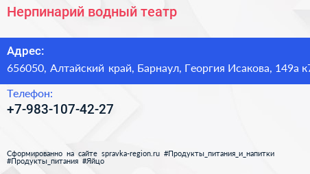 Нерпинарий, водный театр по адресу 656050, Алтайский край, Барнаул, Георгия Исакова, 149а к7 в дальнейшем Организация, размещена в следующих категориях: