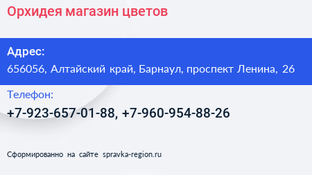 Орхидея, магазин цветов по адресу 656056, Алтайский край, Барнаул, проспект Ленина, 26 в дальнейшем Организация, размещена в следующих категориях:
