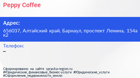 Peppy Coffee по адресу 656037, Алтайский край, Барнаул, проспект Ленина, 154а к2 в дальнейшем Организация, размещена в следующих категориях: