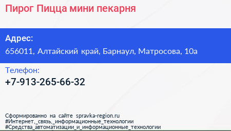Пирог & Пицца, мини-пекарня по адресу 656011, Алтайский край, Барнаул, Матросова, 10а в дальнейшем Организация, размещена в следующих категориях: