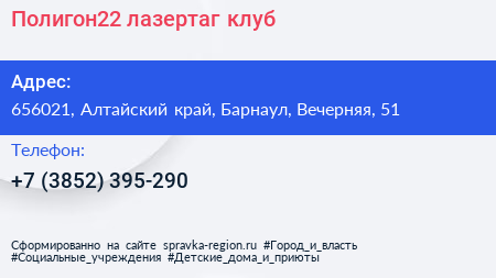 Полигон22, лазертаг-клуб по адресу 656021, Алтайский край, Барнаул, Вечерняя, 51 в дальнейшем Организация, размещена в следующих категориях: