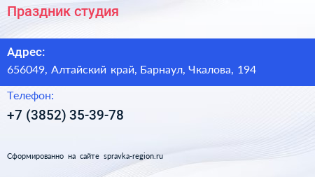 Праздник, студия по адресу 656049, Алтайский край, Барнаул, Чкалова, 194 в дальнейшем Организация, размещена в следующих категориях: