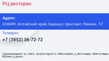 РЦ, ресторан по адресу 656049, Алтайский край, Барнаул, проспект Ленина, 57 в дальнейшем Организация, размещена в следующих категориях: