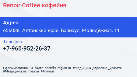 Renoir Coffee, кофейня по адресу 656038, Алтайский край, Барнаул, Молодёжная, 11 в дальнейшем Организация, размещена в следующих категориях: