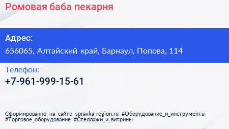 Ромовая баба, пекарня по адресу 656065, Алтайский край, Барнаул, Попова, 114 в дальнейшем Организация, размещена в следующих категориях: