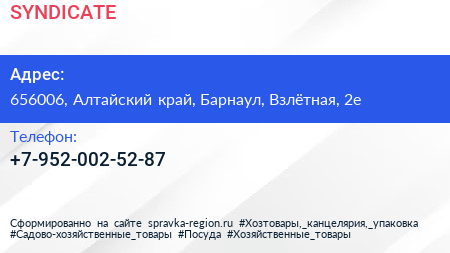 SYNDICATE по адресу 656006, Алтайский край, Барнаул, Взлётная, 2е в дальнейшем Организация, размещена в следующих категориях: