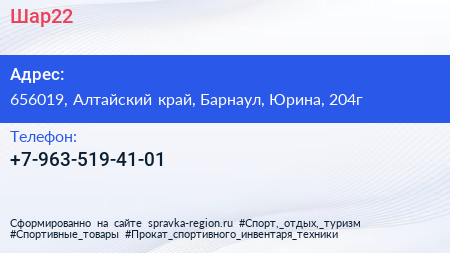 Шар22 по адресу 656019, Алтайский край, Барнаул, Юрина, 204г в дальнейшем Организация, размещена в следующих категориях: