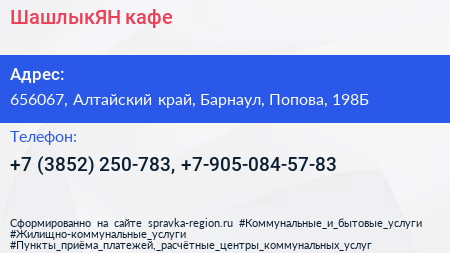 ШашлыкЯН, кафе по адресу 656067, Алтайский край, Барнаул, Попова, 198Б в дальнейшем Организация, размещена в следующих категориях: