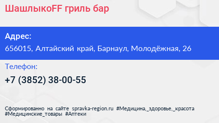 ШашлыкоFF, гриль-бар по адресу 656015, Алтайский край, Барнаул, Молодёжная, 26 в дальнейшем Организация, размещена в следующих категориях: