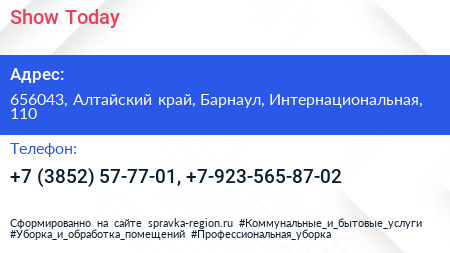 Show Today по адресу 656043, Алтайский край, Барнаул, Интернациональная, 110 в дальнейшем Организация, размещена в следующих категориях:
