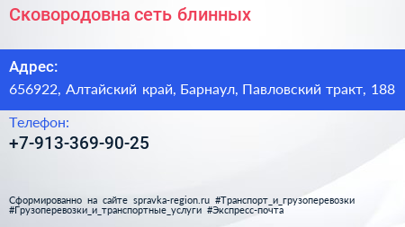 Сковородовна, сеть блинных по адресу 656922, Алтайский край, Барнаул, Павловский тракт, 188 в дальнейшем Организация, размещена в следующих категориях: