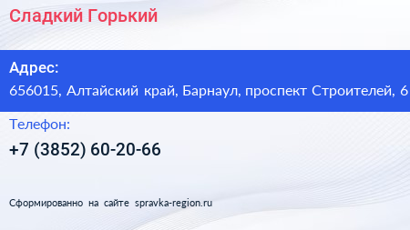 Сладкий Горький по адресу 656015, Алтайский край, Барнаул, проспект Строителей, 6 в дальнейшем Организация, размещена в следующих категориях: