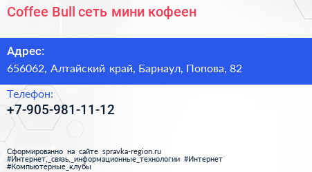 Сoffee Bull, сеть мини-кофеен по адресу 656062, Алтайский край, Барнаул, Попова, 82 в дальнейшем Организация, размещена в следующих категориях: