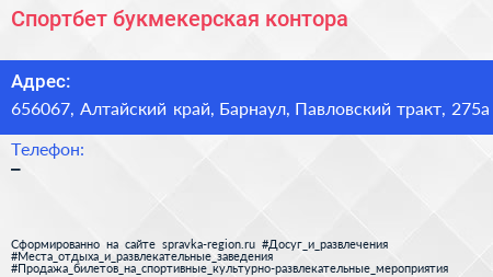Спортбет, букмекерская контора по адресу 656067, Алтайский край, Барнаул, Павловский тракт, 275а в дальнейшем Организация, размещена в следующих категориях: