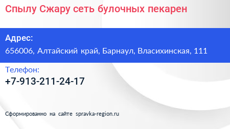 Спылу Сжару, сеть булочных-пекарен по адресу 656006, Алтайский край, Барнаул, Власихинская, 111 в дальнейшем Организация, размещена в следующих категориях: