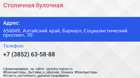Столичная, булочная по адресу 656049, Алтайский край, Барнаул, Социалистический проспект, 70 в дальнейшем Организация, размещена в следующих категориях: