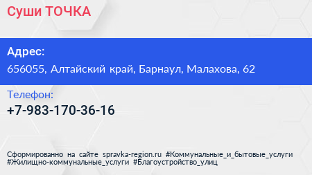 Суши ТОЧКА по адресу 656055, Алтайский край, Барнаул, Малахова, 62 в дальнейшем Организация, размещена в следующих категориях: