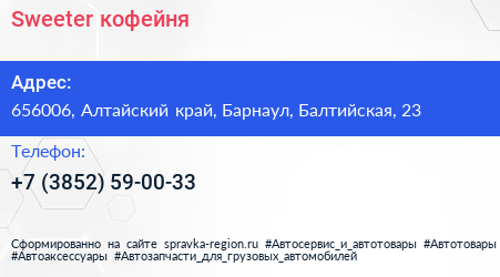 Sweeter, кофейня по адресу 656006, Алтайский край, Барнаул, Балтийская, 23 в дальнейшем Организация, размещена в следующих категориях: