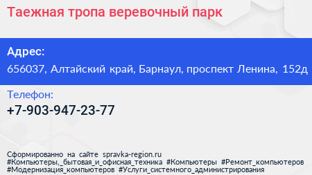 Таежная тропа, веревочный парк по адресу 656037, Алтайский край, Барнаул, проспект Ленина, 152д в дальнейшем Организация, размещена в следующих категориях: