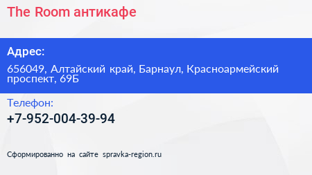 The Room, антикафе по адресу 656049, Алтайский край, Барнаул, Красноармейский проспект, 69Б в дальнейшем Организация, размещена в следующих категориях: