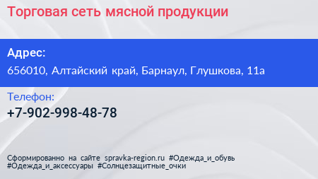 Торговая сеть мясной продукции по адресу 656010, Алтайский край, Барнаул, Глушкова, 11а в дальнейшем Организация, размещена в следующих категориях: