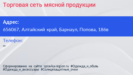 Торговая сеть мясной продукции по адресу 656067, Алтайский край, Барнаул, Попова, 186в в дальнейшем Организация, размещена в следующих категориях: