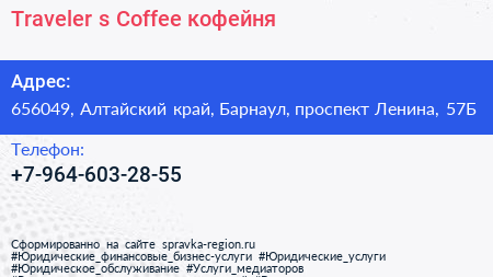Traveler`s Coffee, кофейня по адресу 656049, Алтайский край, Барнаул, проспект Ленина, 57Б в дальнейшем Организация, размещена в следующих категориях: