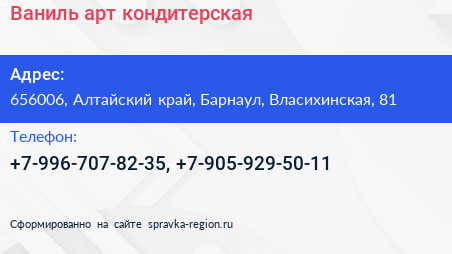 Ваниль, арт-кондитерская по адресу 656006, Алтайский край, Барнаул, Власихинская, 81 в дальнейшем Организация, размещена в следующих категориях: