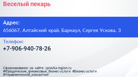 Веселый пекарь по адресу 656067, Алтайский край, Барнаул, Сергея Ускова, 3 в дальнейшем Организация, размещена в следующих категориях: