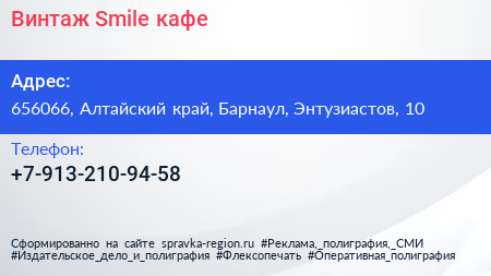 Винтаж Smile, кафе по адресу 656066, Алтайский край, Барнаул, Энтузиастов, 10 в дальнейшем Организация, размещена в следующих категориях: