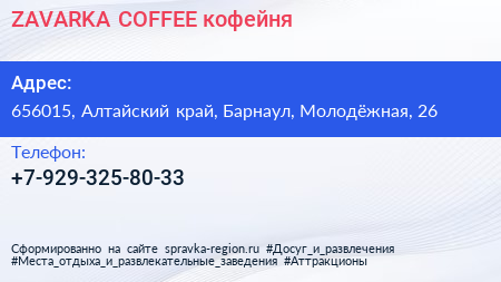 ZAVARKA COFFEE, кофейня по адресу 656015, Алтайский край, Барнаул, Молодёжная, 26 в дальнейшем Организация, размещена в следующих категориях: