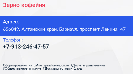 Зерно, кофейня по адресу 656049, Алтайский край, Барнаул, проспект Ленина, 47 в дальнейшем Организация, размещена в следующих категориях: