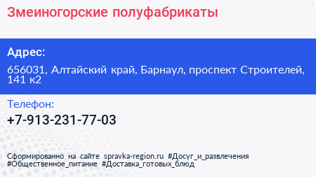 Змеиногорские полуфабрикаты по адресу 656031, Алтайский край, Барнаул, проспект Строителей, 141 к2 в дальнейшем Организация, размещена в следующих категориях: