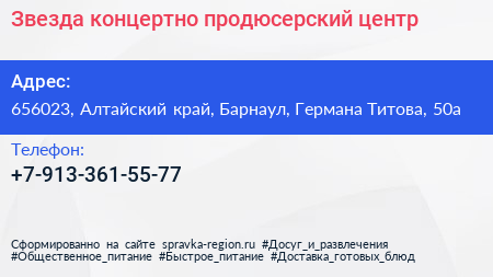 Звезда, концертно-продюсерский центр по адресу 656023, Алтайский край, Барнаул, Германа Титова, 50а в дальнейшем Организация, размещена в следующих категориях: